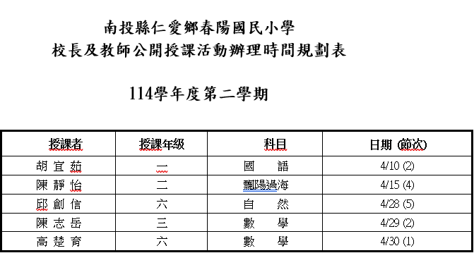 本校校長及教師公開授課活動辦理時間規劃表 114學年度第二學期
